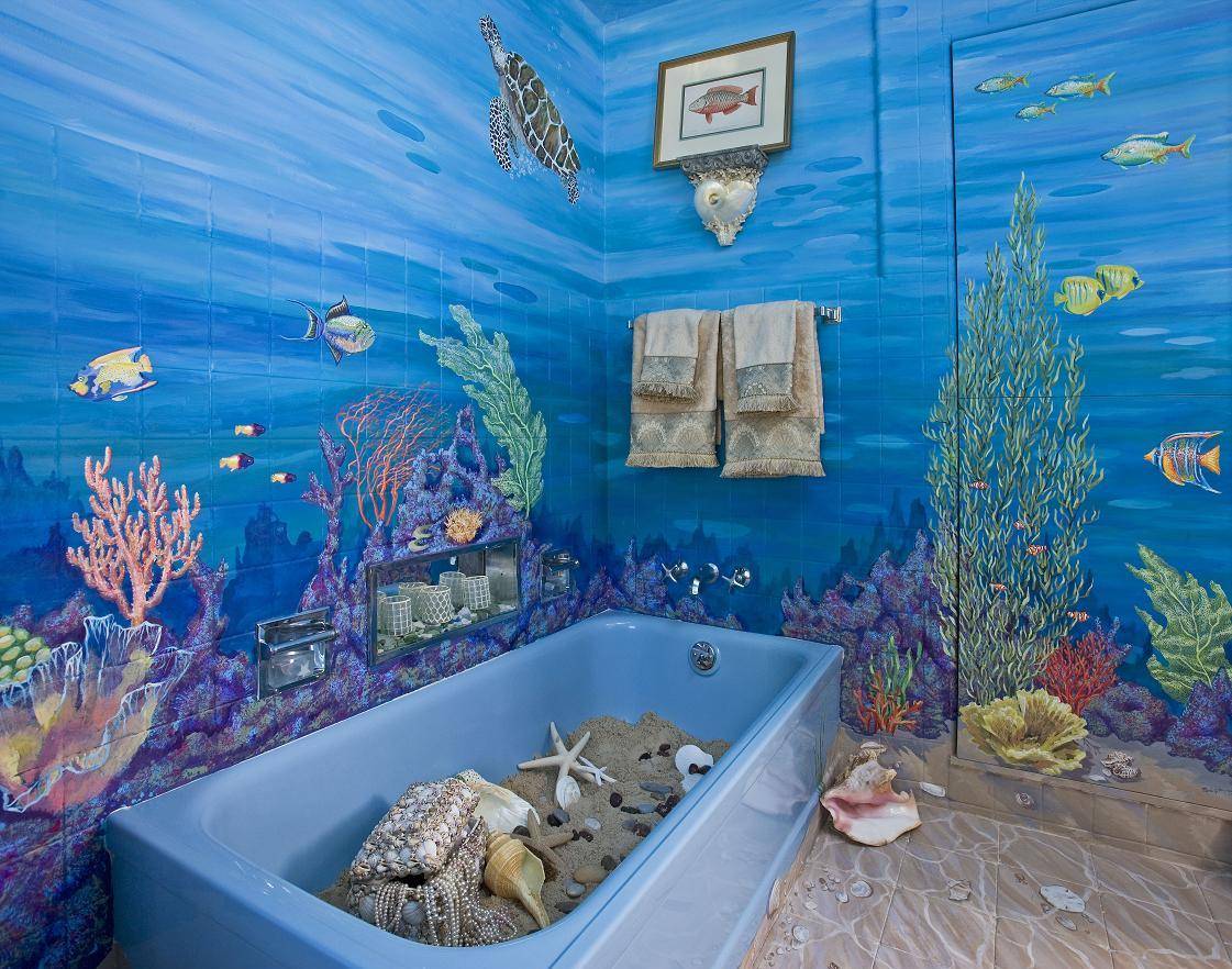 Роспись на стенах можно придать ванной необычный вид. Перед росписью стены ровняют и шпаклюют, если нужно грунтуют. Расписывают акриловыми красками, так как они устойчивы к влаге. Фон выбирают нейтральный – голубой, белый, бежевый. Когда роспись высохнет, стены покрывают лаком.