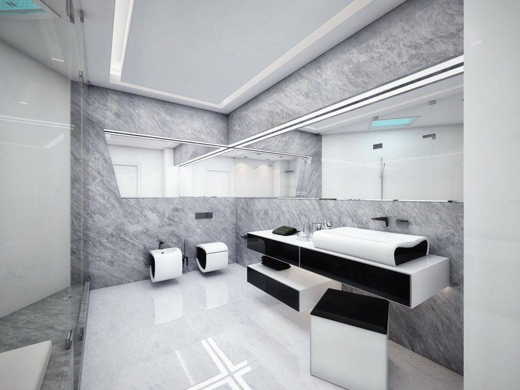 Модерн характерны яркие расцветки и смелые контрасты. Это подходящий вариант для ванной комнаты любой площади;