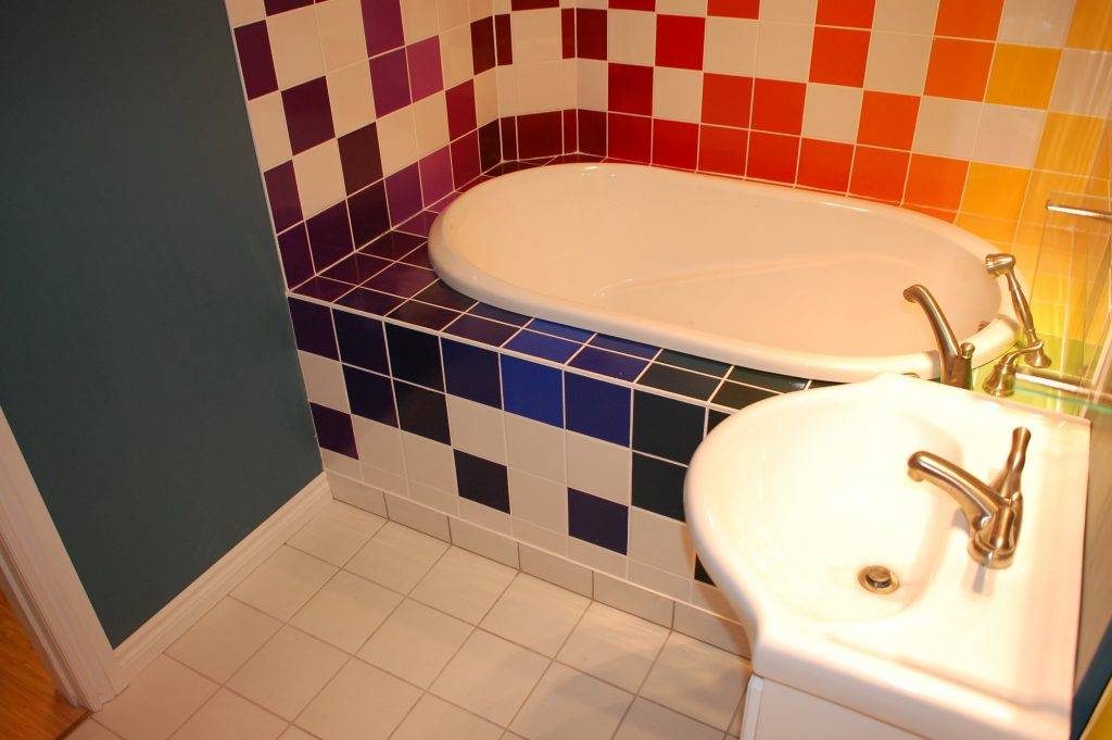 - В небольшом помещении ванной комнаты можно укладывать не более 4 вертикальных рядов керамической плитки. Большой собственный вес может подорвать нижние ряды и нарушить прочность крепления их к стене. По этой причине после монтажа декоративного фриза работу нужно приостановить до высыхания клея.