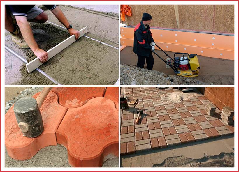 Отмостку следует укладывать со стороны фундамента. При этом плитку монтируют от себя, что позволяет избежать нарушения целостности слоя подушки. Каждую плитку следует укладывать в строго отведенное для нее место. Затем элементы подбиваются резиновым молотком. Для выравнивания используется уровень. Удары по плитке осуществляться через дощечку. Это позволяет избежать раскалывания плитки. При опускании плитки ниже необходимого уровня под нее подсыпается готовая смесь.