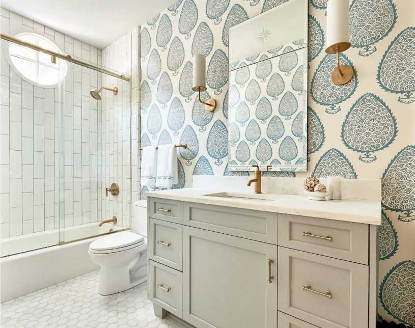 На стенах допускается легкая игра с текстурой и не слишком контрастный орнамент. Это актуально для маленьких ванных. Тонкая игра с геометрией позволяет визуально увеличить пространство.