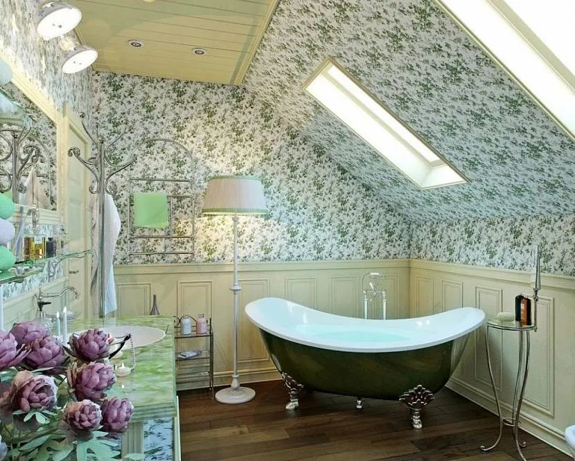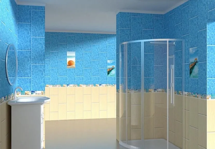 Вариант 2. Нижняя часть стен ванной комнаты обшивается пластиковыми панелями, а верхняя – красится или на них наклеиваются обои. Панели также крепятся на поверхность стен возле ванны.