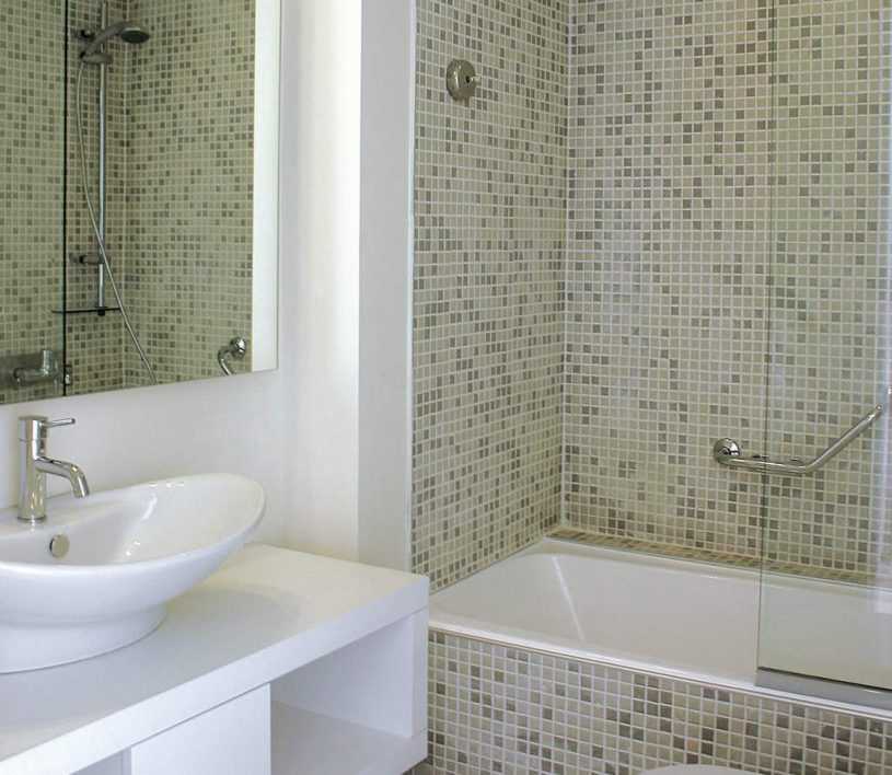 Вариант 3. На стенах, где находятся раковина и ванна, произведена отделка мозаичной плиткой, на сухой стене – обои.