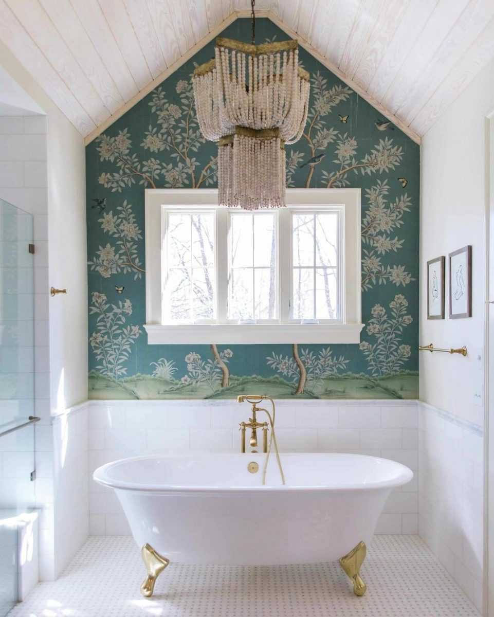 Обрати внимание на моющиеся водостойкие обои. Это не самая обычная фактура для ванной комнаты, поэтому в современном стиле она смотрится интересным и ненавязчивым вызовом