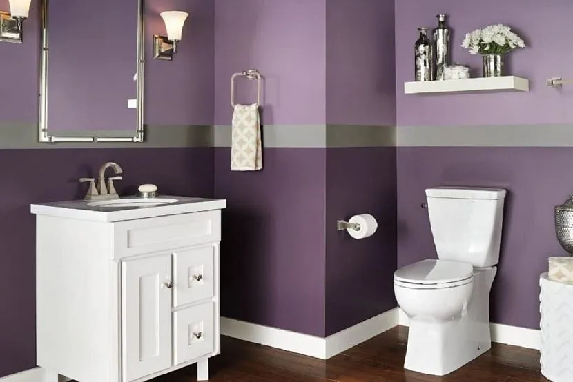 Краска – доступная альтернатива плитке в ванной комнате. Эмалевое покрытие может быть как однотонным, так и многоцветным. Дизайн в вертикальную или горизонтальную полоску помогает визуально скорректировать недостатки помещения. На перегородках в санузле роскошно смотрятся авторские рисунки. Если нет художественных талантов, то часто используют трафареты.