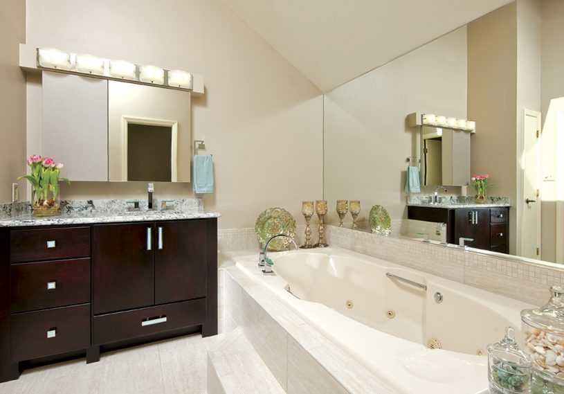 Овальная чаша в виде большого камня выглядит одновременно просто и экстравагантно. Угловые ванны или ванны, установленные по диагонали – воплощение той самой модерновой асимметрии. Джакузи с подсветкой, гидромассажем и другими дополнительными опциями – самое современное и стильное решение.