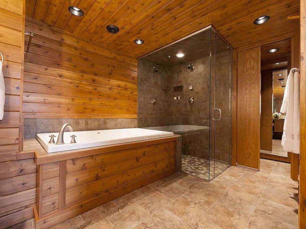 Деревянная вагонка часто используется для отделки стен просторных ванн в загородных домах