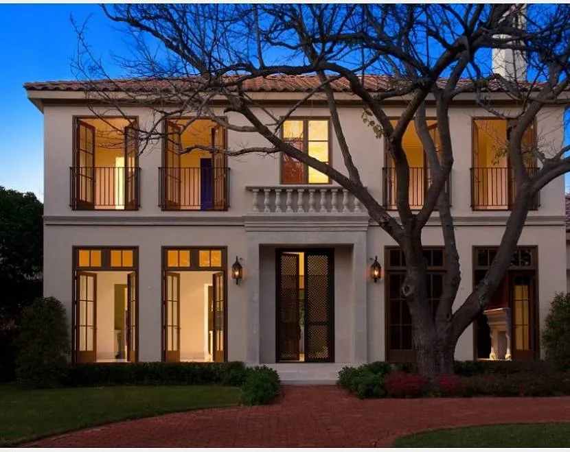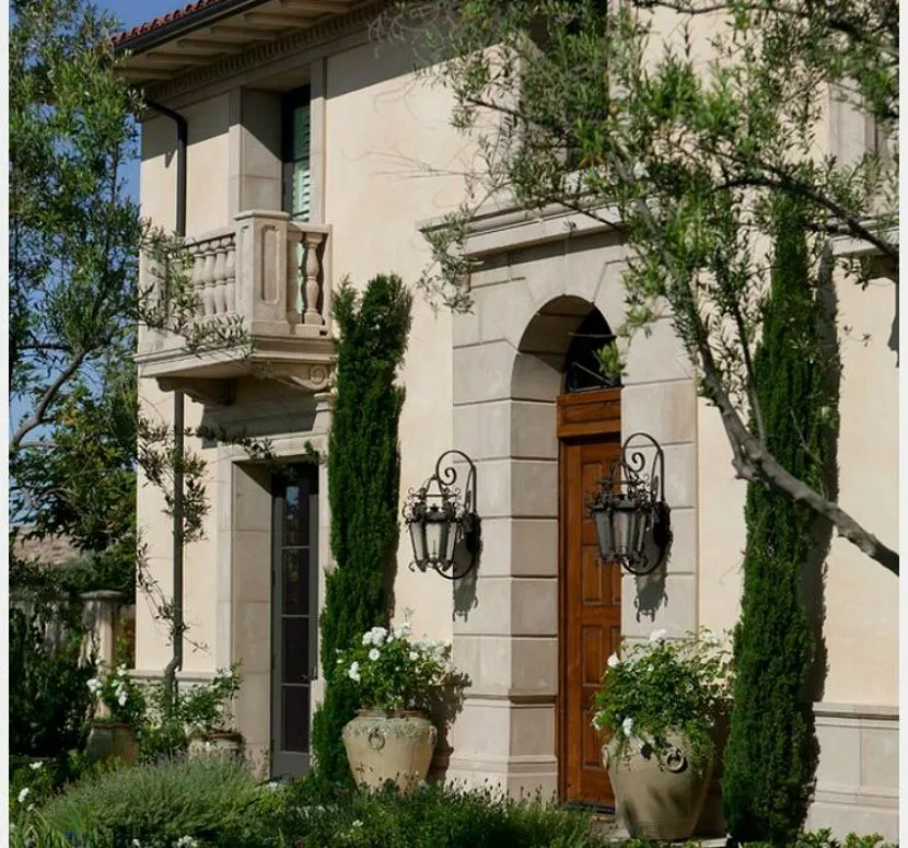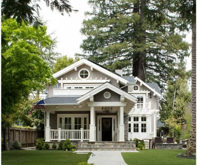 Дизайн фасада двухэтажного дома в колониальном стиле можно гармонично дополнить такими элементами экстерьера, как ажурные заборы и подвесные светильники.