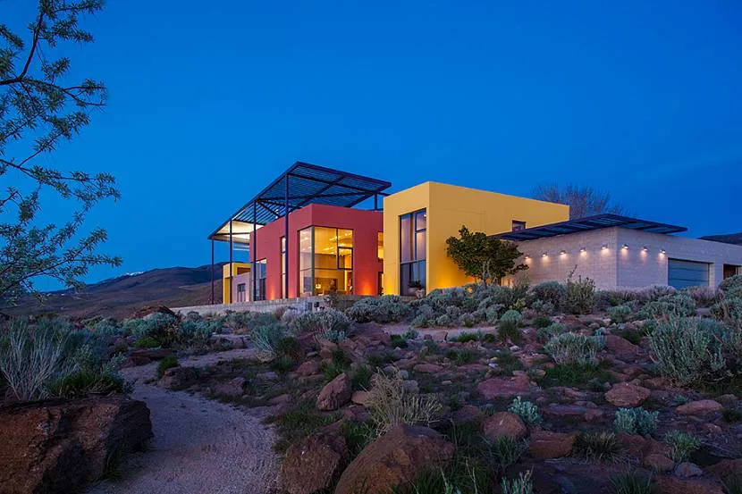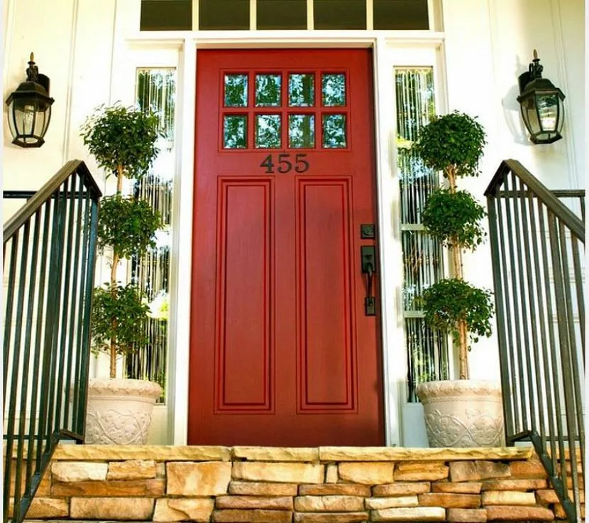 Дизайн фасада загородного дома хорошо будет смотреться с вертикальными и ярко окрашенными композитными панелями. Яркий цвет главного фасада можно подчеркнуть с помощью белой границы оконных и дверных проемов и лестничных ограждений.