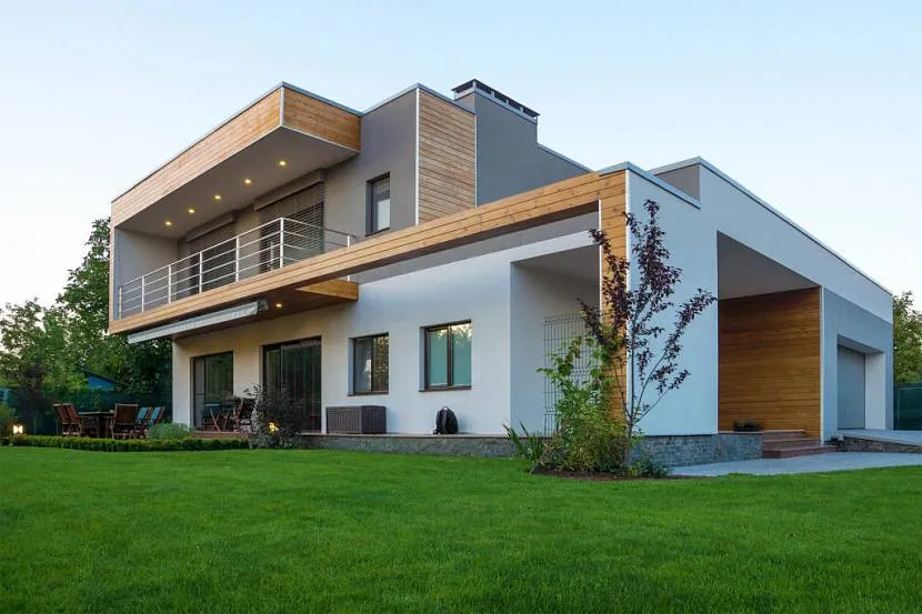 Для загородного дома подходящим решением будет использование натуральных отделочных материалов – горизонтально или вертикально ориентированных деревянных досок. Строгий минимализм эффектно смотрится на фоне ухоженного участка.