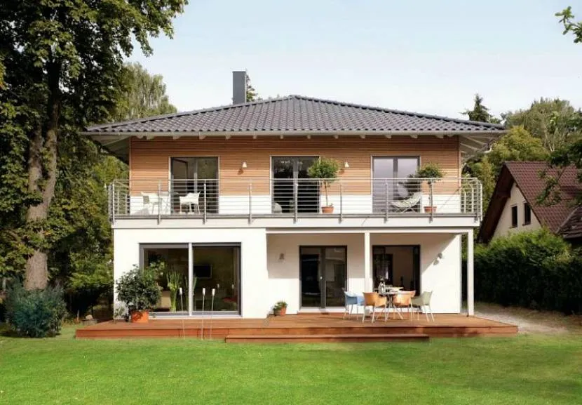 При обустройстве экстерьера двухэтажных домов используют полимерные и натурального происхождения материалы.