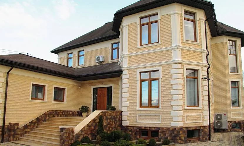 Популярны при строительстве и термопанели, состоящие из двух слоев: первый – утеплитель, а второй – декоративное покрытие. Приобретение такого материала позволяет сократить время на отделку фасада, так как пропадает необходимость отдельно утеплять стены, обеспечивается надежная защита коробки дома от внешних воздействий. Может применяться при любых типах основания. Основу термопанелей составляет пенополистирол или пенополиуретан, а декоративным слоем выступает клинкер, искусственный камень, керамика или керамогранит. Перед выбором нужно учитывать, что цена термопанелей для наружной отделки дома стартует от 1200-1600 рублей за м².