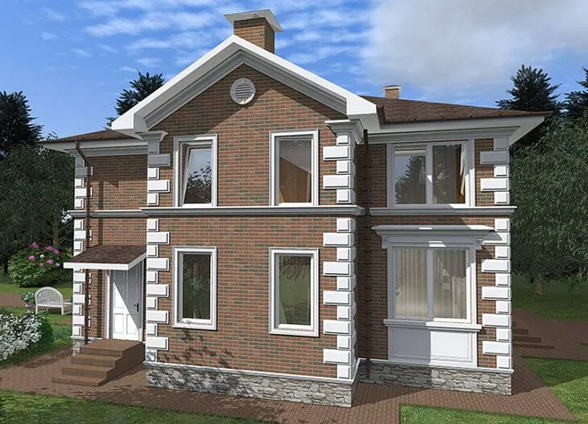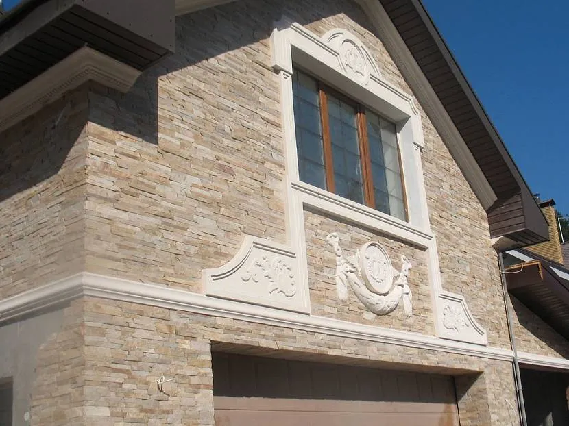 Каменные панели визуально напоминают кирпичную кладку. Детали используют для украшения цоколя, углов здания или колонн. Чтобы получить оригинальный экстерьер, дизайнеры комбинируют несколько видов декоративных элементов. Отделка выглядит выигрышнее в контрастных сочетаниях и светлее (темнее) основного фона на пару оттенков.