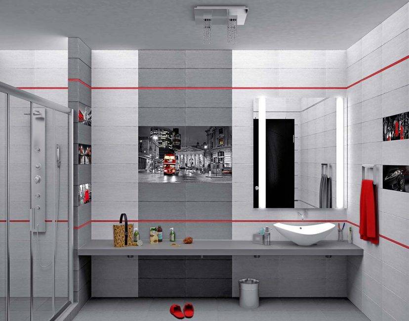 Стильное панно из серой плитки с рисунком в ванной