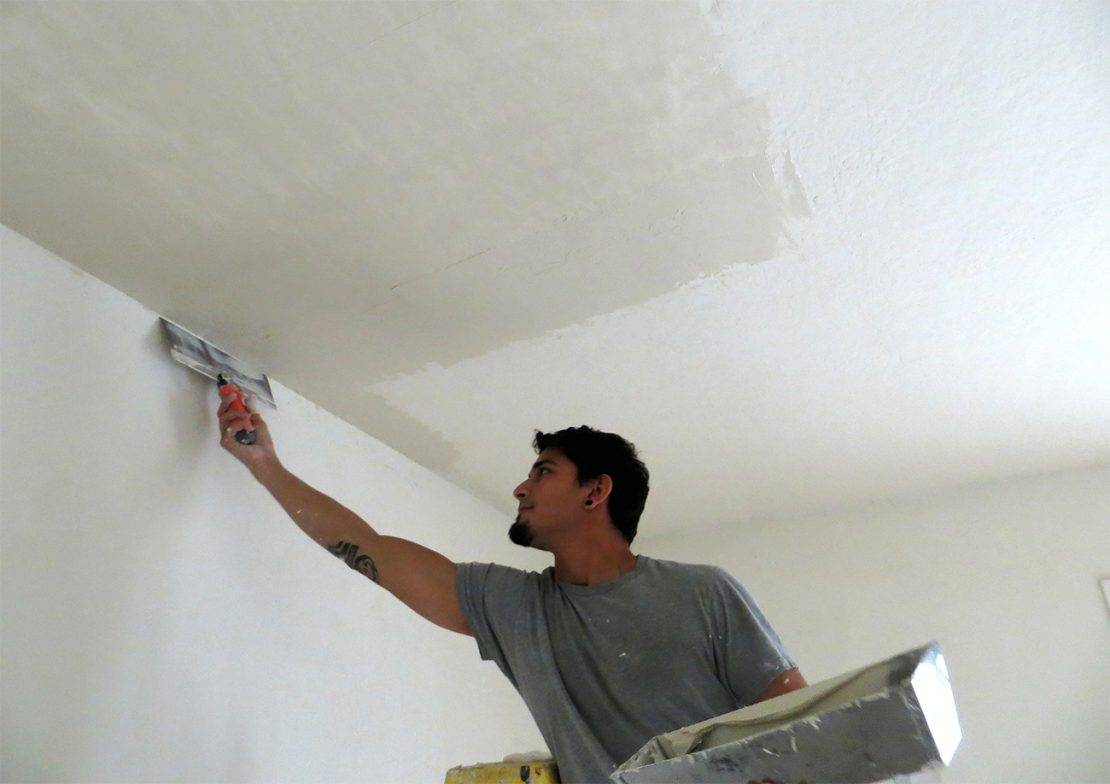 В случае, если на потолке была наклеены обои, то их нужно удалить. Если на поверхности потолка остаются следы старого клейкого вещества, то следует их удалить с помощью дополнительных средств, например, металлического шпателя. В идеале, потолок стоит очистить до бетонного слоя.