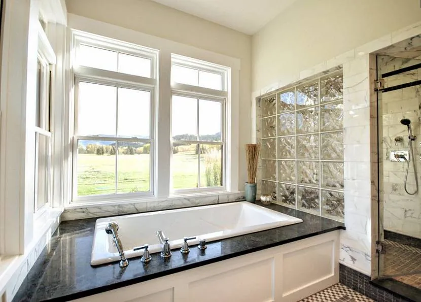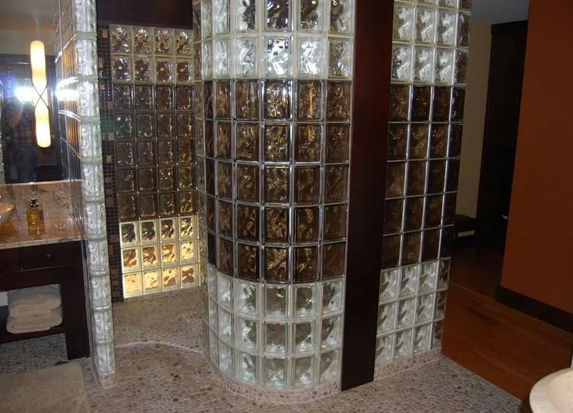Особенности стеклоблоков – отличная звукоизоляция, влагоустойчивость, хорошее теплосбережение. По этой причине материал часто используют в общественных помещениях для водных процедур. В настоящее время изделия применяют в ванных комнатах и душевых кабинах, выкладывают перегородки, стойки и проемы для окон.