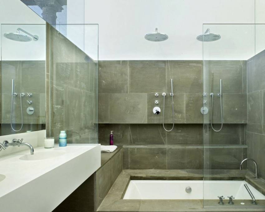 Перегородки из цветного и простого стекла в интерьере ванной комнататы