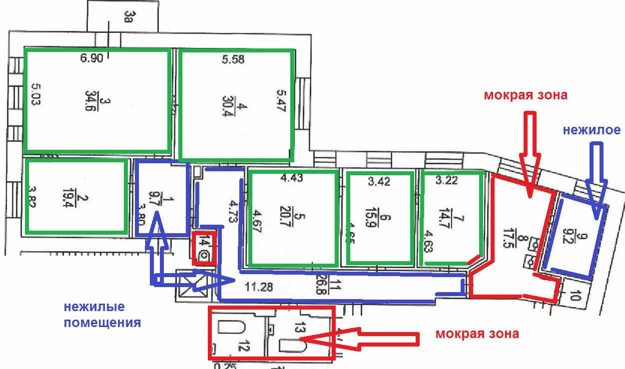 Помещения «мокрого» типа категорически запрещается переносить и расширять за счет жилых комнат, а также за счет кухни. Однако если вы проживаете в квартире на первом по счету жилом этаже, то эти ограничения на вас не распространяются. То же можно сказать и о владельцах квартир, расположенных на втором этаже, под которыми расположены помещения нежилые — магазины, парикмахерские и т.д.