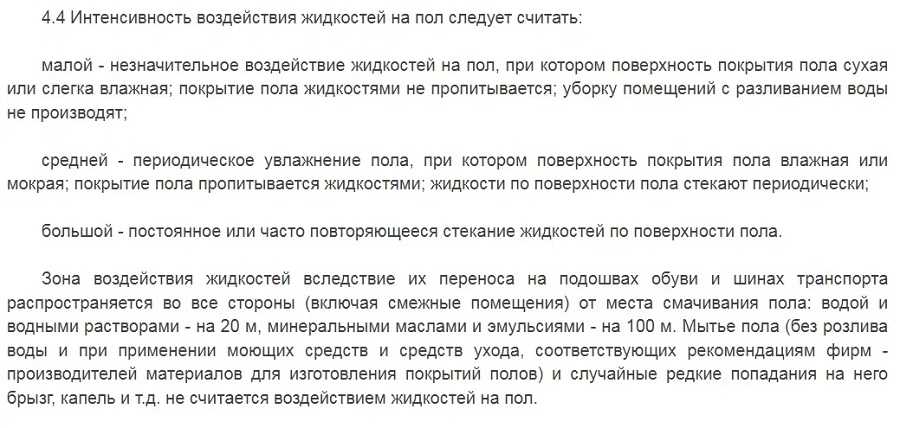 Также п. 4.4.СП 29-13330-2011 “Полы” вводит понятие “Интенсивность воздействия жидкостей”. Интенсивность по СП может быть малой, средней и большой. Пункт 7.1 СП предусматривает требование по гидроизоляции при средней и большой интенсивности воздействия жидкостей на пол.