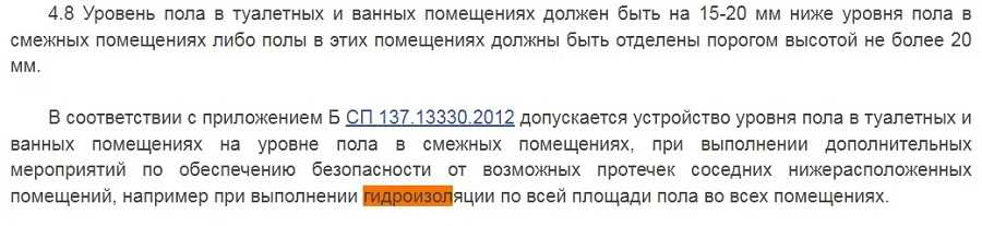 - Если уровень пола в ванной или туалете выше уровня пола в остальных помещениях, эти помещения должны иметь гидроизоляцию по всей площади.