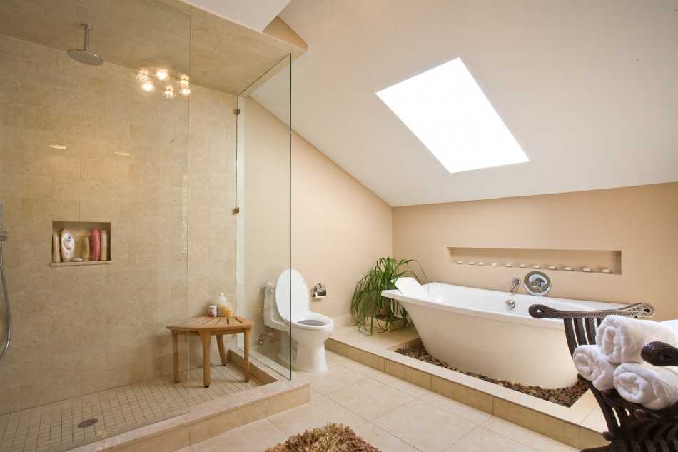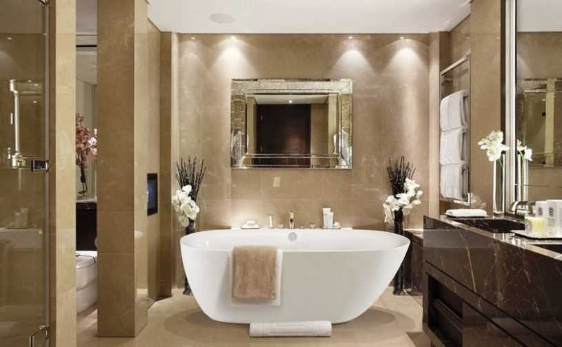 Важно, чтобы ничего не мешало свободному перемещению — чтобы не было опасности натыкаться на острые углы и выпирающие элементы — такой интерьер вызовет лишь неудобство. Что касается освещения, то дизайнеры рекомендуют для ванной среднего размера создать многоуровневое освещение — минимум, чтобы было 2 уровня