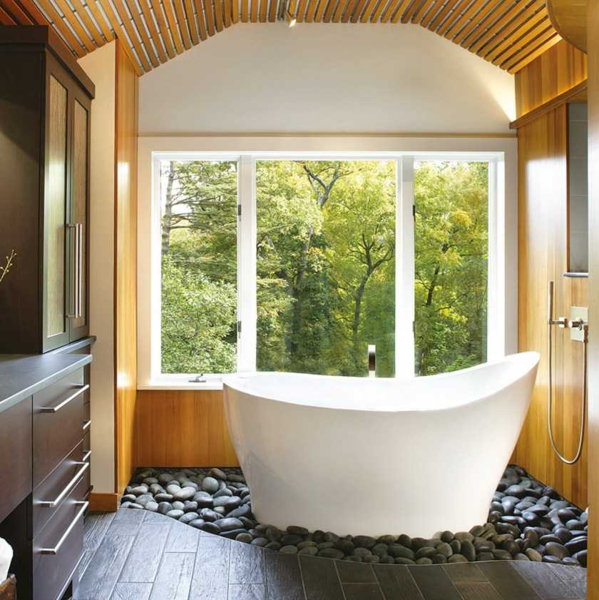 Сразу же оговоримся, что панорамные окна (одно или несколько) это идея для планировки ванной комнаты в частном доме, когда хозяин не ограничен рамками типового проекта, и не вынужден выискивать варианты размещения необходимой мебели и приборов в уже имеющемся пространстве.