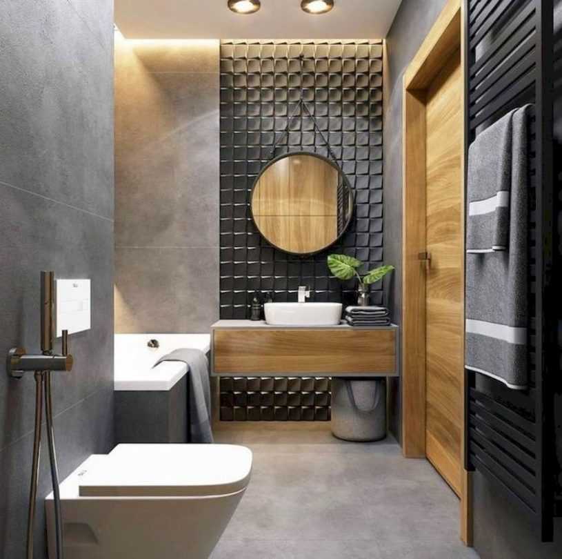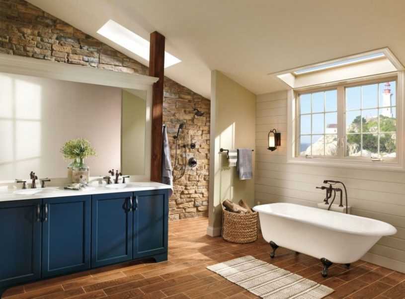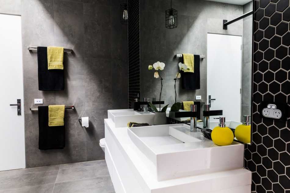 Полноценный дизайн состоит из аксессуаров, банных принадлежностей, которые размещают в соответствии с «правилами вытянутой руки».