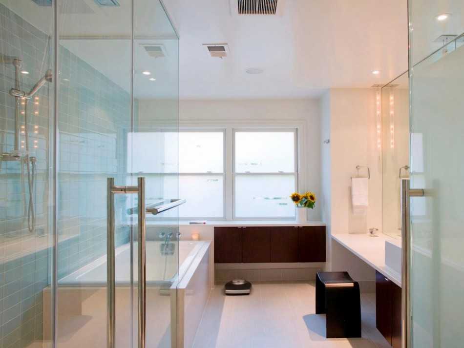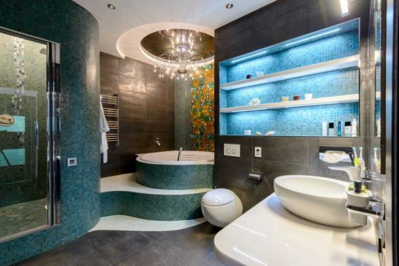 Использование стеклянных полок, столешниц из прочного закаленного прозрачного стекла придаст помещению воздушность и легкость, зрительно расширит его, сделает больше. Такой дизайн создает «невесомый» интерьер, который превратит ванную в стильное и красивое помещение. Что касается потолка, то подвесные варианты для оформления такой ванны — оптимальное решение. Они могут быть выполнены в любом дизайне, прекрасно смотрятся, придают завершенности помещению, дорого и благородно выглядят.