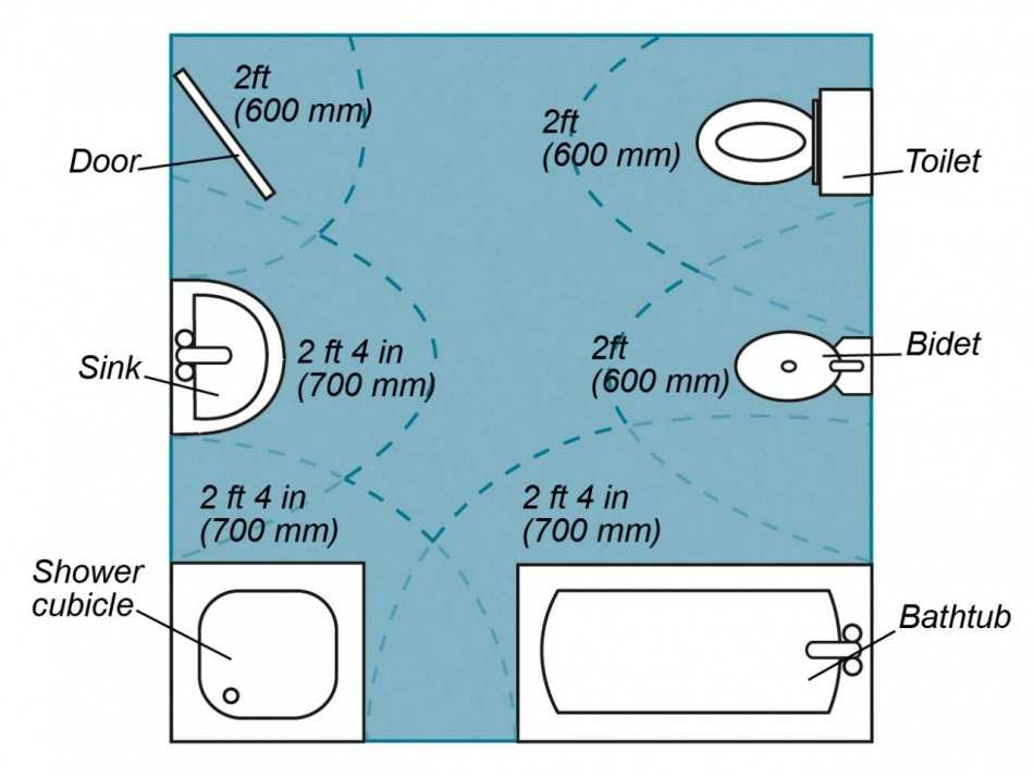 Когда продумывается планировка ванной, нужно принимать во внимание не только место, где непосредственно находится сантехническое оборудование, но и область пространства, находящуюся рядом с ним.
