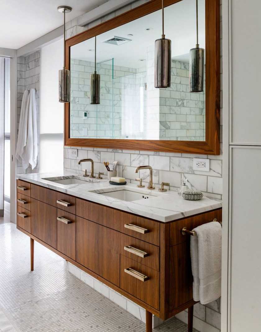 Модерн предполагает использование больших зеркал в рамке, ассиметричной мебели, сантехники, фурнитуры.