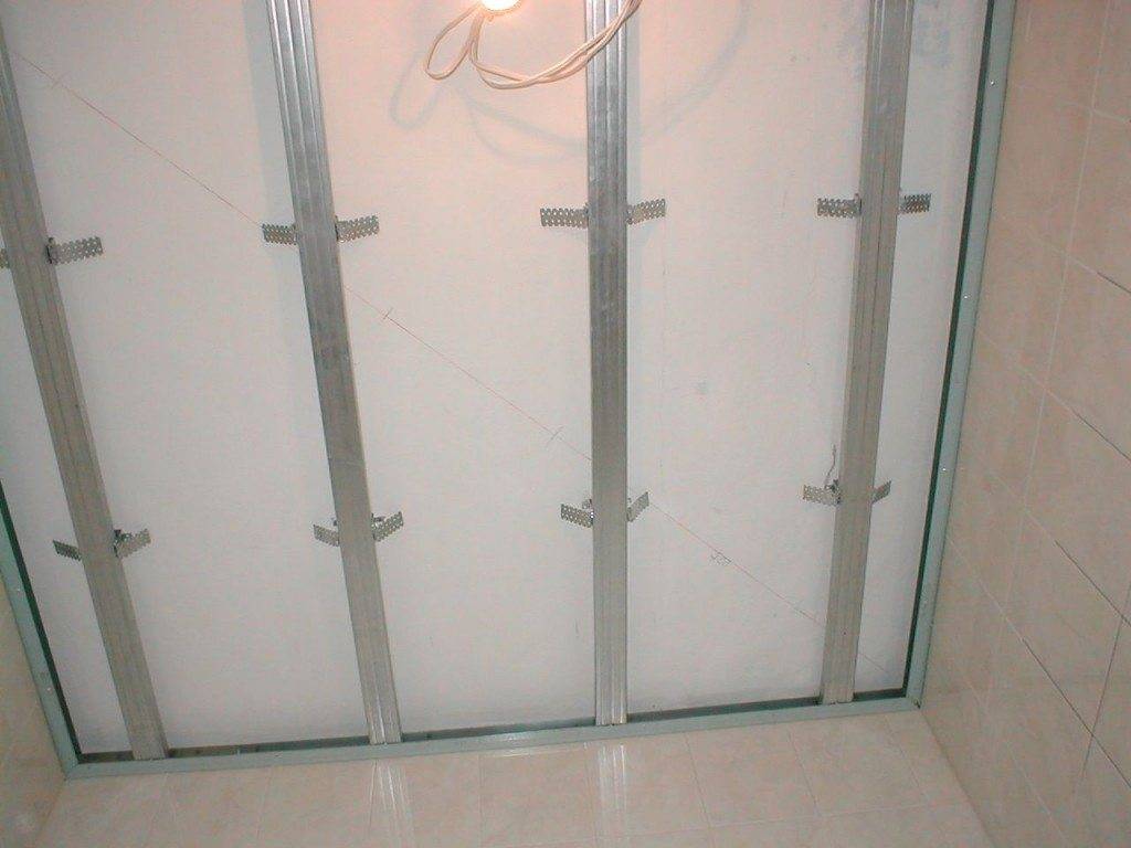 - Профили CD будут провисать, и поэтому нужно эту плоскость нивелировать. Учитывая то, что ванная комната, как правило, небольшая – нивелирование плоскости можно провести строительным правилом, прикладывая его под профили UD, прикрученные к стенке.