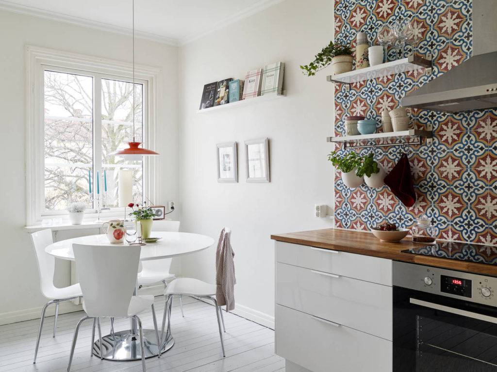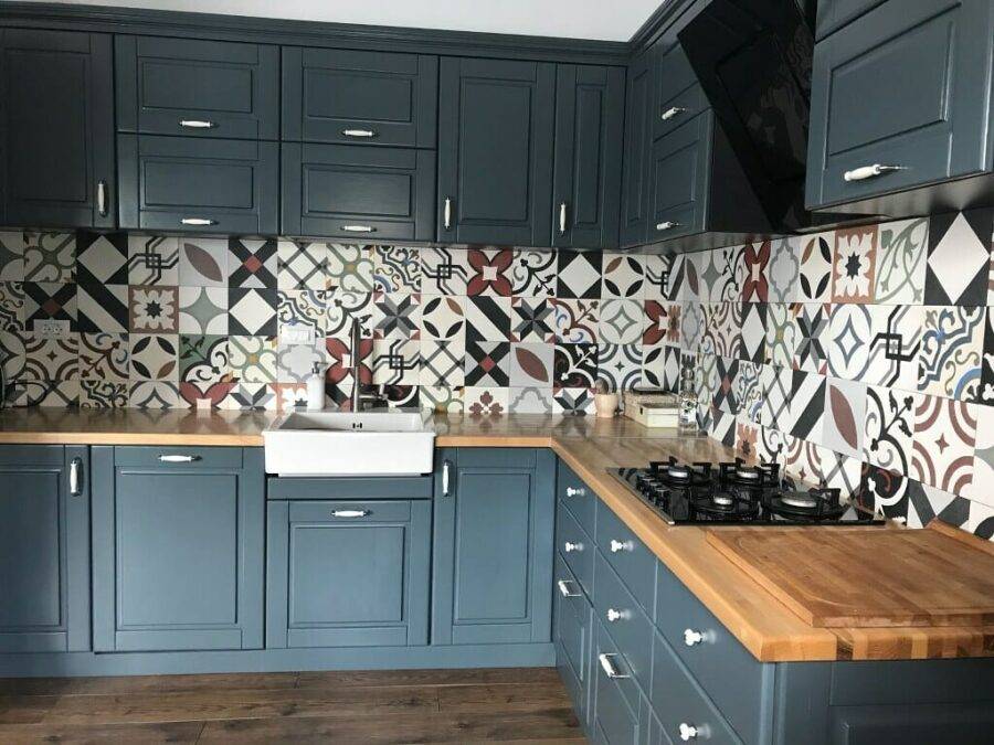 Цементная плитка ярких цветов с причудливым рисунком всегда является сильным цветовым акцентом на стене над кухонной столешницей. Она приятно оживляет, согревает и добавляет динамики простым кухонным решениям. Цементная плитка для кухни в силу своей декоративности может выступать фрагментарно — только вокруг «влажной зоны» на кухне, то есть вокруг мойки и посудомоечной машины, или в виде яркого «тротуара» в пространстве пола на кухне.