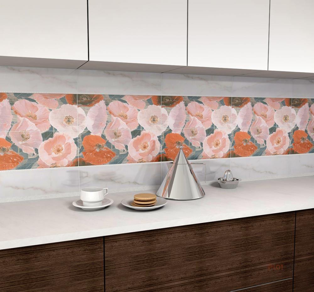 В коллекции плитки производители часто включают панно — модули с изображением цветов, животных, пейзажей и т.д. Размер картины составляет 50х50 см и более. Она может быть цельной либо составной. Во втором случае изображение собирают из 4 или 6 фрагментов.