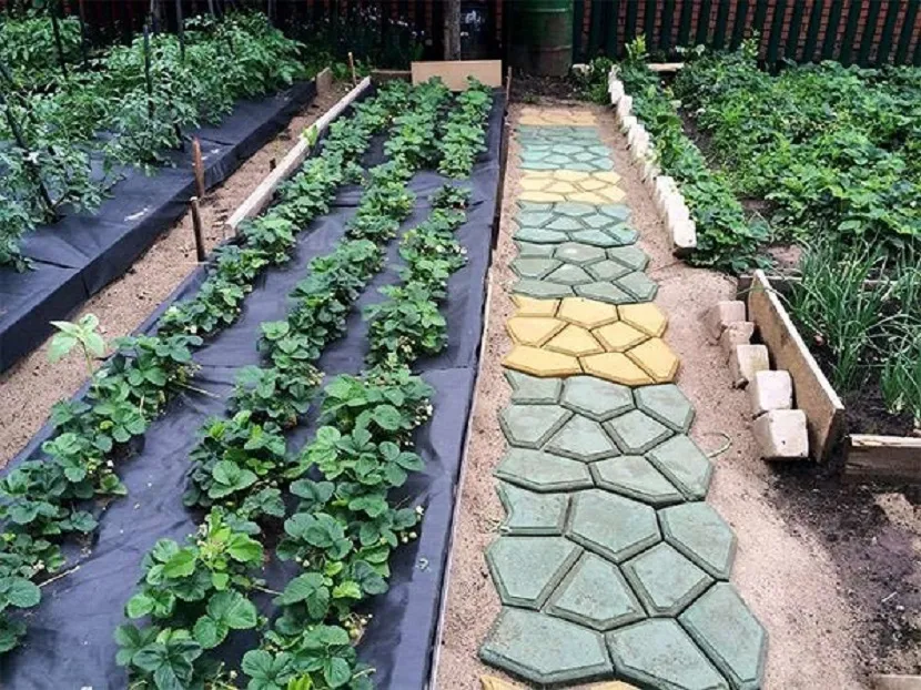 Если хочется добавить участку оригинальности и цвета, из кафеля можно выложить небольшие тропинки возле беседок или вокруг дома. Для дорожек между грядками придется поискать более подходящее решение.