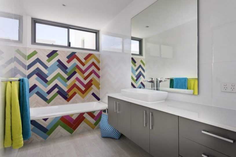 Дизайнеры применяют способы визуального разделения пространства, используя бордюр, узкий или широкий, яркий декор, который выделяется на фоне остальной плитки, разные способы укладки, прямой, диагональный, «елочкой», с перехлестом.