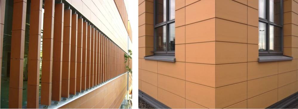 Терракотовые панели производят из глины, которую обжигают в печи при температуре около 1200 С в течение 10-ти часов. Синтетические добавки для изготовления не используют. Технология наделяет материал красивой фактурой и прочностью. Служат такие панели долго, но по устойчивости к внешним воздействиям уступают композитным изделиям и клинкерной плитке. Чтобы повысить стойкость терракотовых панелей к агрессивным воздействиям окружающей среды на производстве на них наносят гидрофобное покрытие. В результате очистка фасада от загрязнений упрощается, изделия получают антибактериальные свойства.