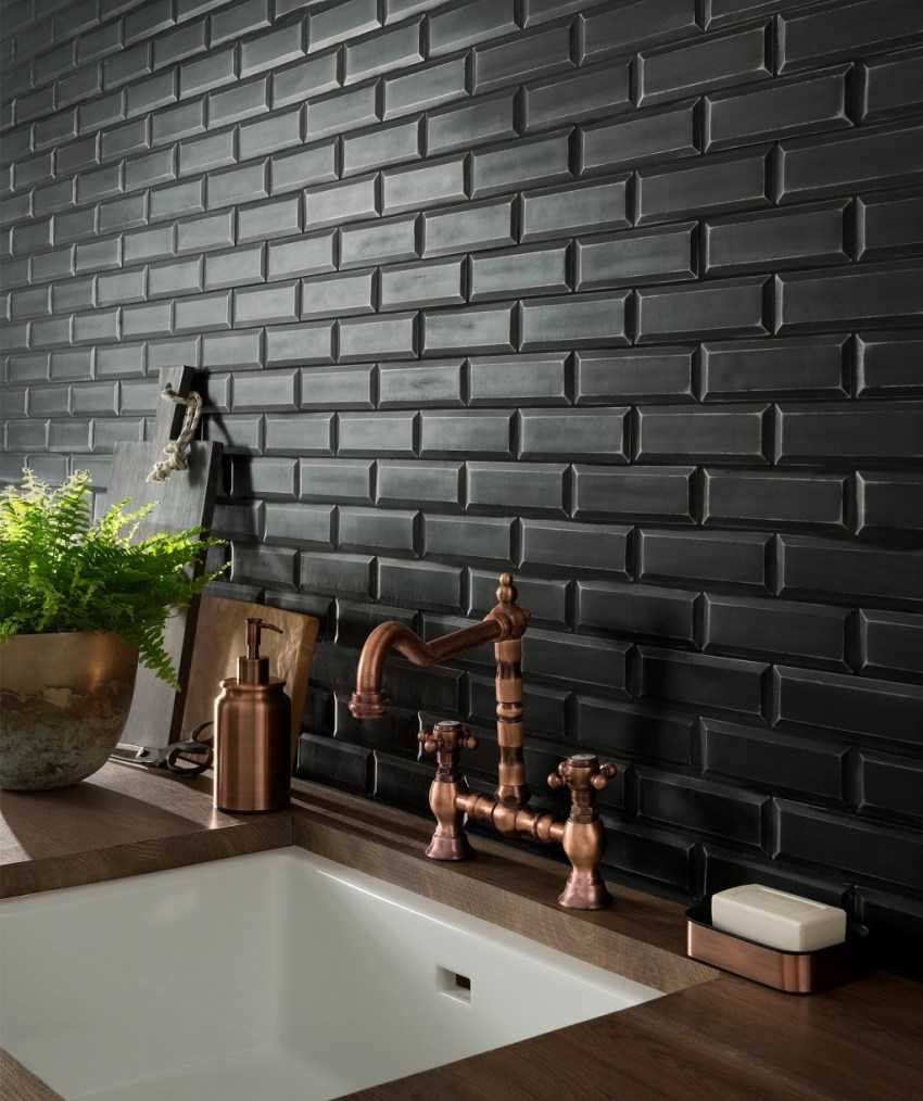 Черная плитка привлекательно смотрится в тандеме с угольной или белоснежной фурнитурой мебели, деревом. Если кухня оформлена в скандинавском дизайне, то гармонично выглядит одна стена, выложенная “кабанчиком”. Остальные лучше всего оклеить обоями.