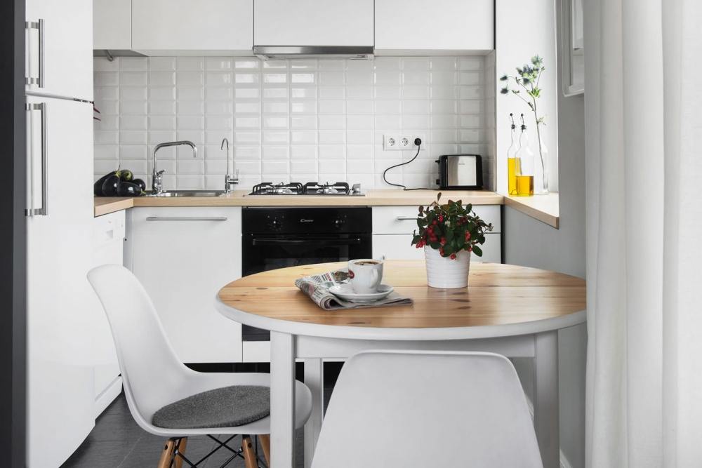 Сочетание в кухне грубых и гладких фактур – это скандинавский стиль. Кирпичная кладка здесь может сочетаться с изящными обоями. Поскольку во многих местах кладку из кирпичей выполнить невозможно, используют изделия «метро».