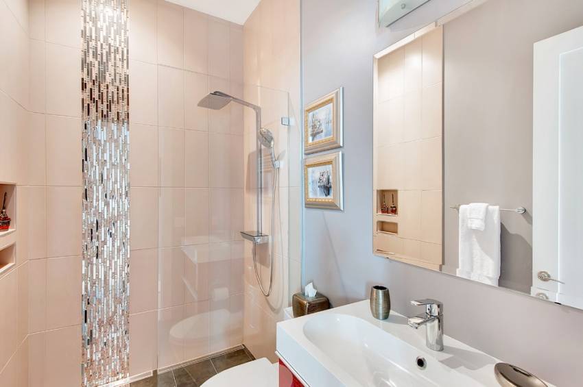 Пример частичного использования зеркальной плитки в душевой кабине ванной комнаты