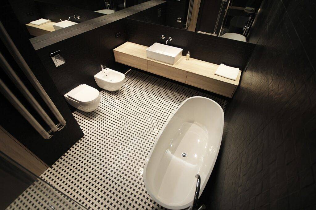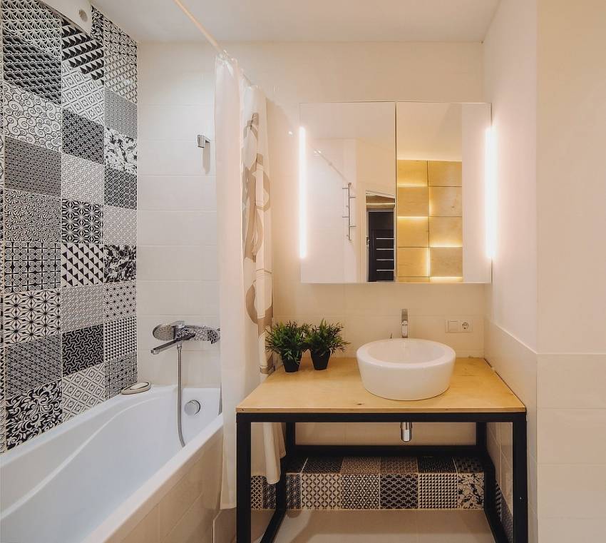 Пример правильной комбинации черно-белой плитки и материалов теплых оттенков, что позволило создать уютный дизайн интерьера ванной комнаты