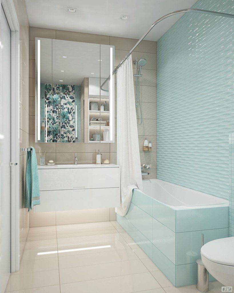 Хорошая процедура, которая оптически увеличивает пространство ванной комнаты, — это расположить плитку на полу ромбовидным узором, а не прямо — параллельно линии стены. Дополнительно в маленьком помещении стоит выбрать светлую плитку, возможно, с контрастными элементами — например, декором или мозаикой.