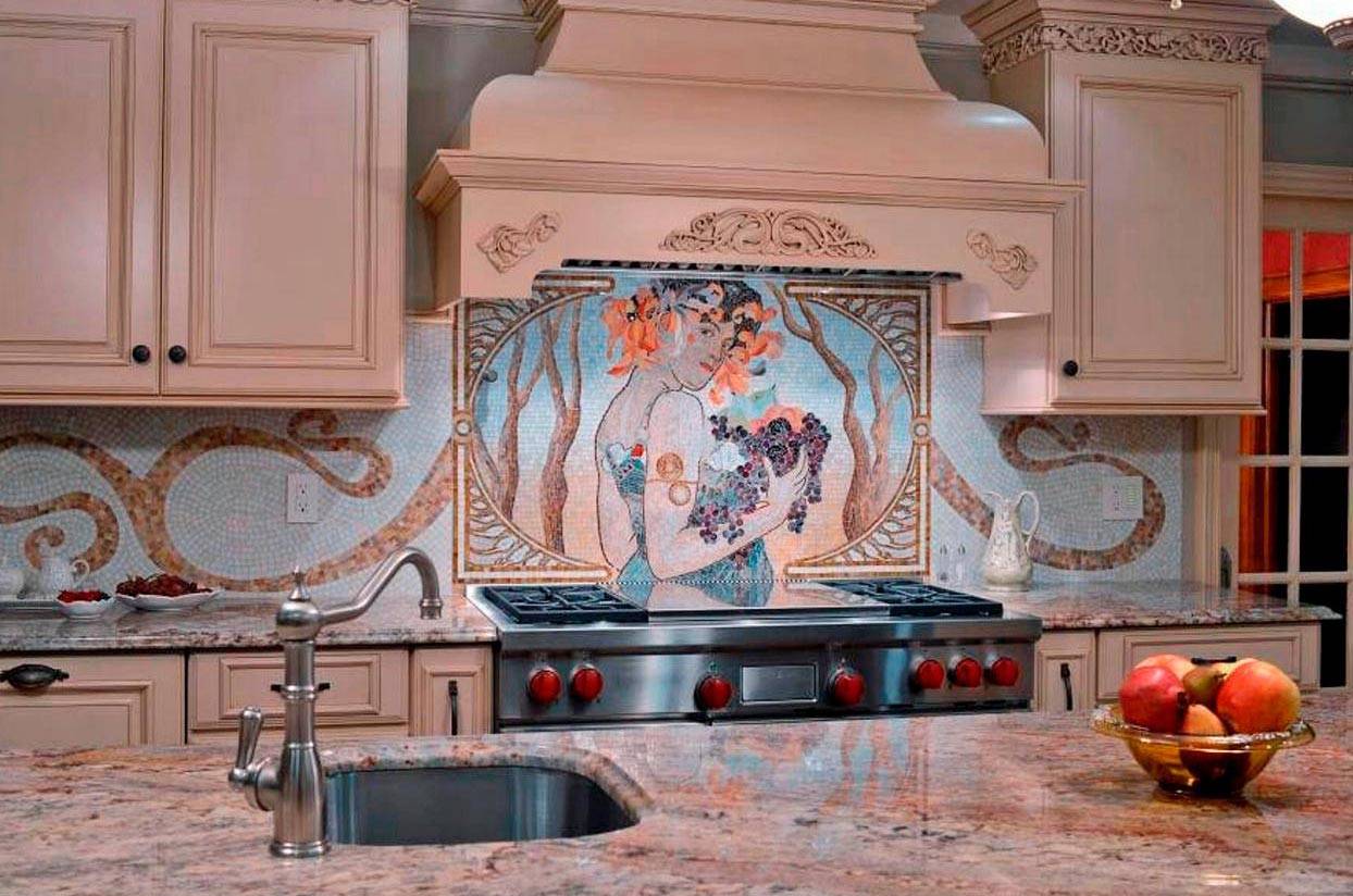 Панно будет ярким и эффектным акцентом в помещении, но справиться с его созданием можно только при высоком уровне мастерства плиточника. Детали располагаются не на матрице, а выкладываются вручную.