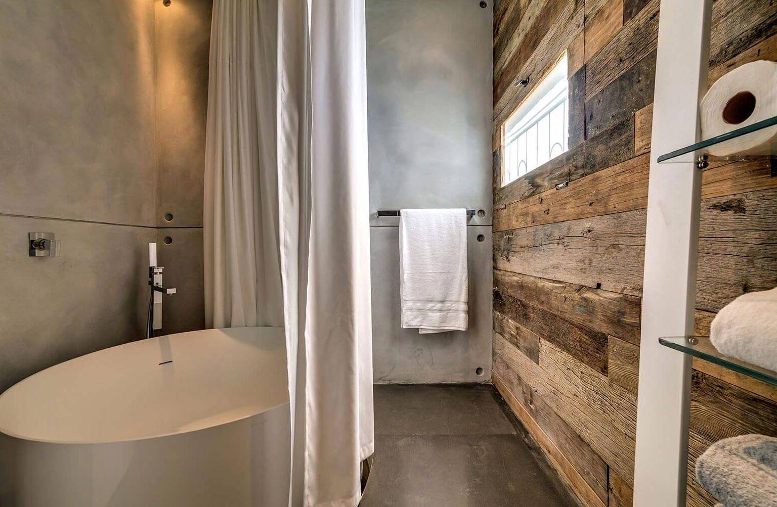 Ванная комната, имеющая отделку в стиле рустик, несмотря на простоту интерьера, выглядит очень стильно. Вся комната оформлена отделкой из натурального дерева. Это позволяет человеку расслабиться и получить наслаждение не только от процедур, но и от ароматов древесины. В таком помещении очень остро чувствуется близость к природе.