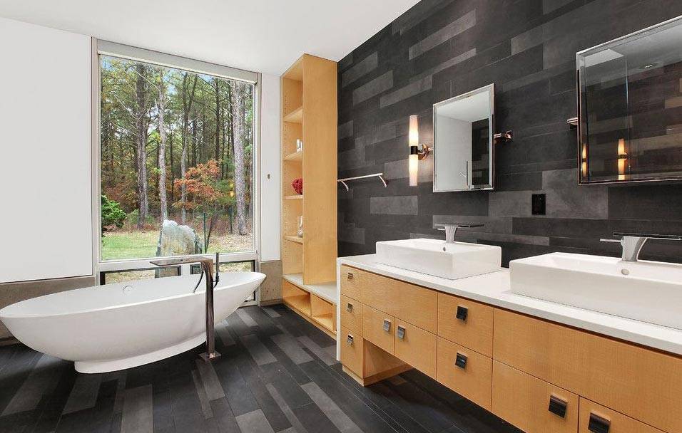 Сейчас в тренде комбинирование различных цветов, структур поверхности и материалов при отделке помещения. Дизайн ванной с плиткой «под дерево» можно разнообразить до бесконечности путем комбинации с другими материалами. Например: