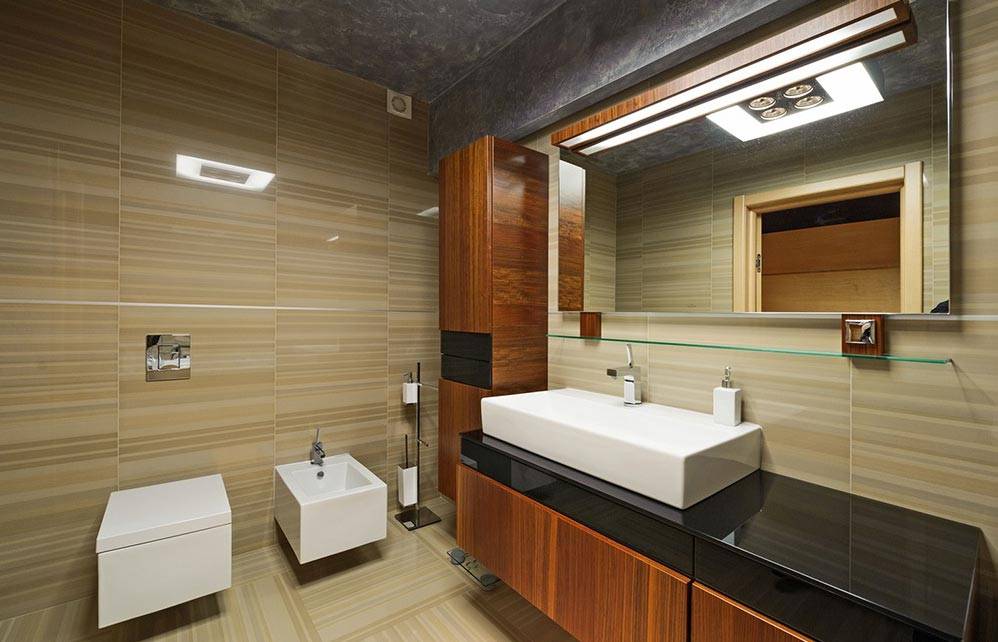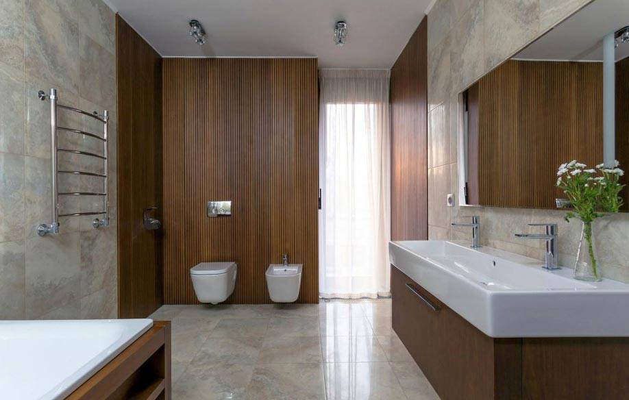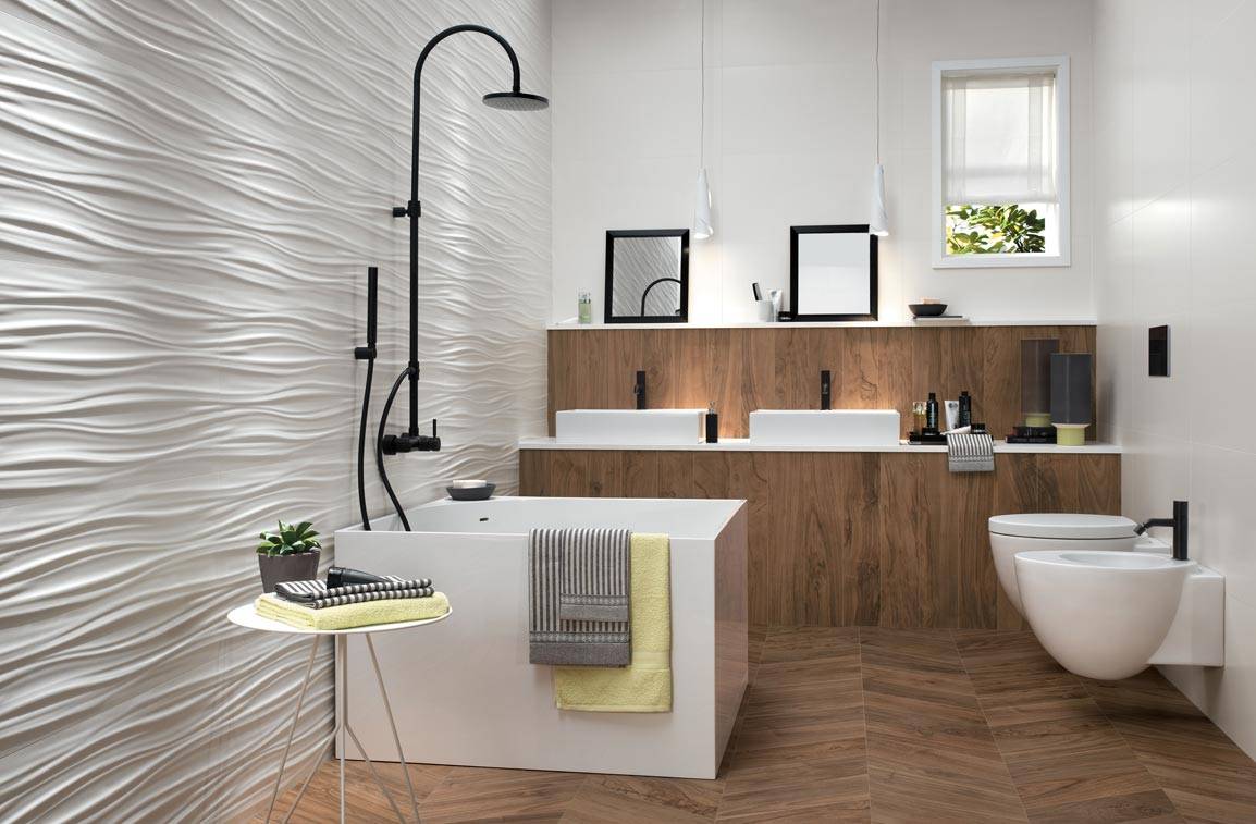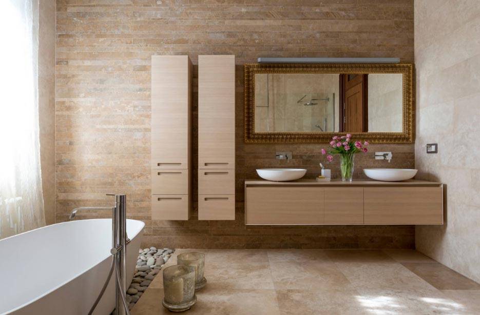 Если цветные – подберите отделочный материал в схожем оттенке, обратите внимание на текстурный и 3D вариант. Если мебель и сантехника коричневые в ванной, выбирайте серую плитку или имитирующую мрамор, травертин