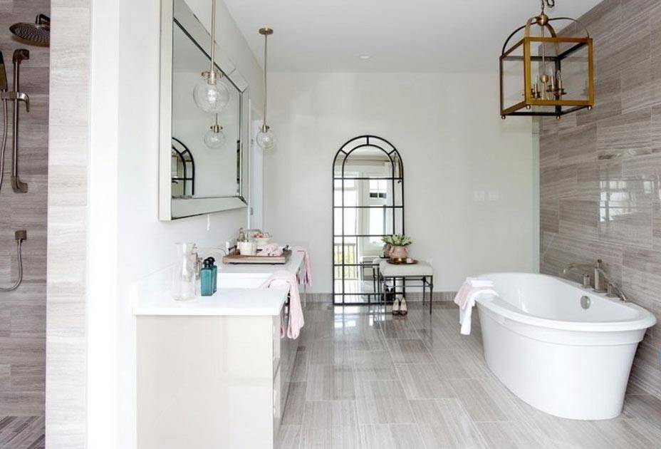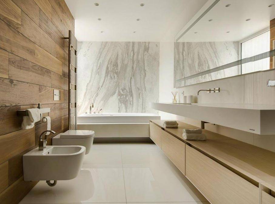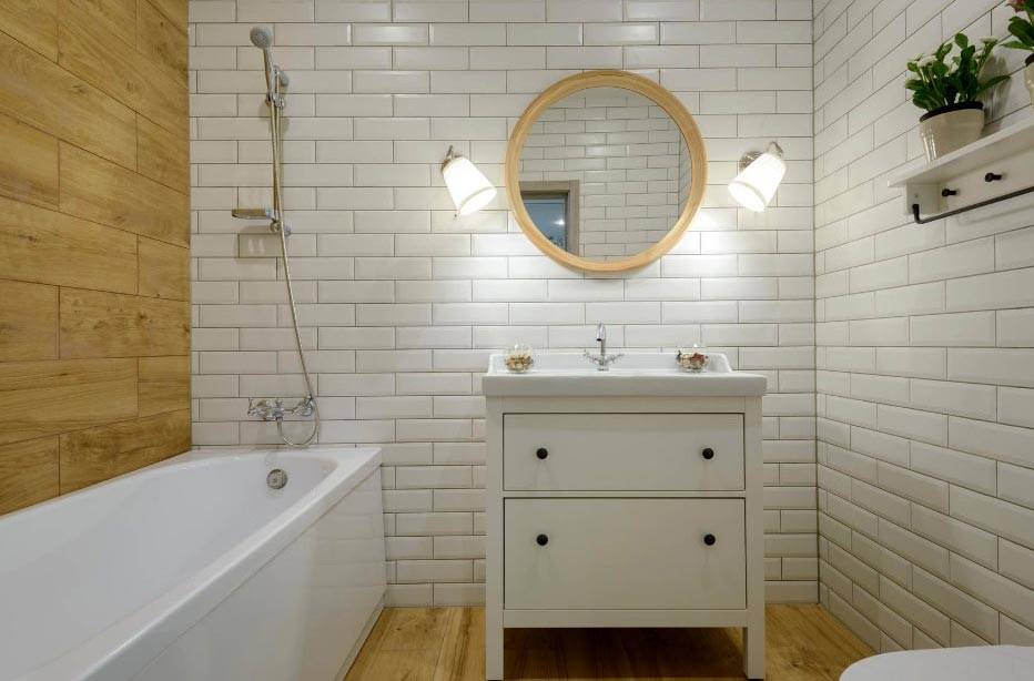Одно из самых популярных – сочетание плитки «под дерево» и мрамора. Теплые оттенки древесины выгодно оттеняют гладкий полированный светлый камень. Шикарно выглядят и вариации на тему лофта – комбинирование облицовки ванны плиткой под дерево и бетона, пластушки, кирпича или другого необработанного натурального камня (или плитки в форме кирпича или камня).