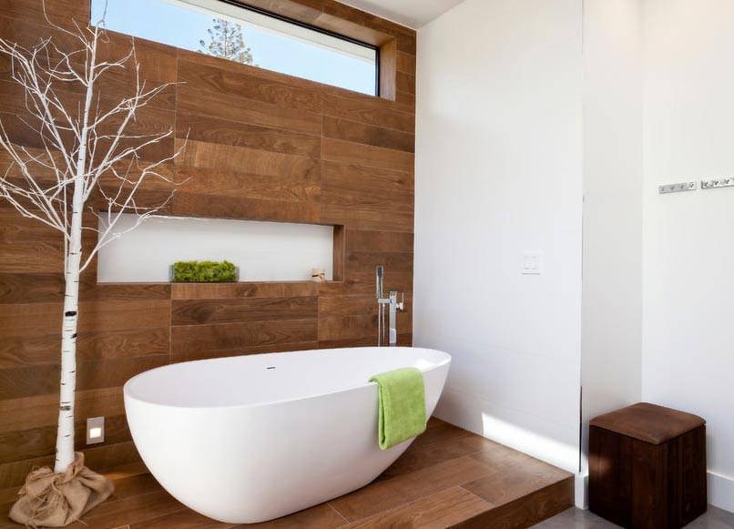 Если ванная комната сделана под дерево, то это требует особого подхода и подготовки. Очень часто такой вариант отделки используется для деревянных домов. Он подойдет для создания интерьеров во многих стилях.