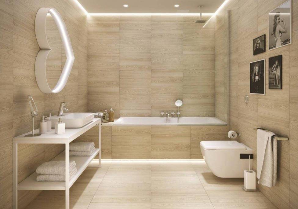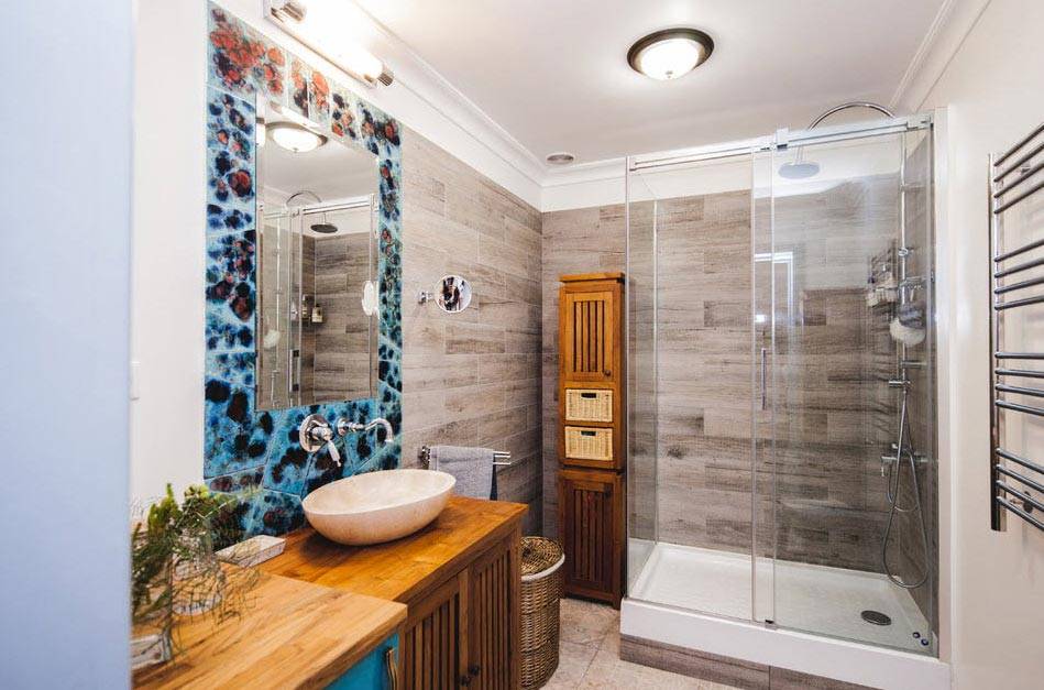 Важно правильно сочетать оттенки керамики и дерева – они не должны быть совершенно одинаковые и в то же время должны иметь совпадающую гамму оттенков – либо теплую, либо холодную.