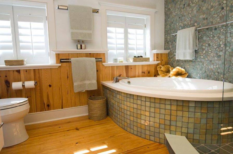 натуральной древесиной. Деревянные элементы редко используются для облицовки помещения. Обычно из древесины делается мебель в просторной ванной – шкафчики, полки, столешницы, лавки и стулья