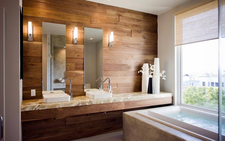 Благодаря разнообразию цветов и факту, дерево в интерьере ванной смотрится всегда оригинально и нескучно. Не обязательно использовать древесную отделку повсеместно, достаточно нескольких ярких акцентов из дерева, которые зададут нужный стиль и настрой. Обычно дизайнеры используют следующие приемы: